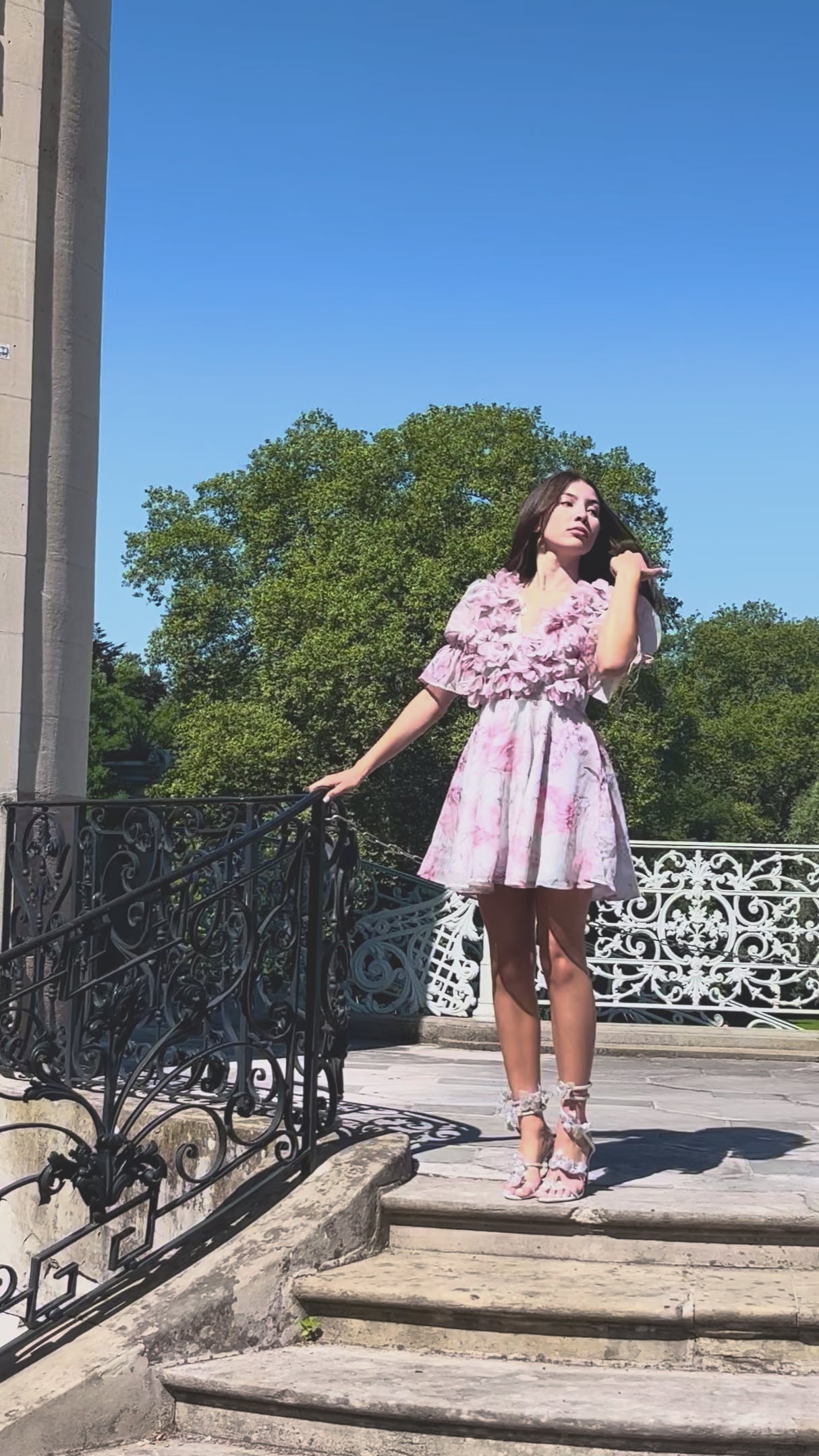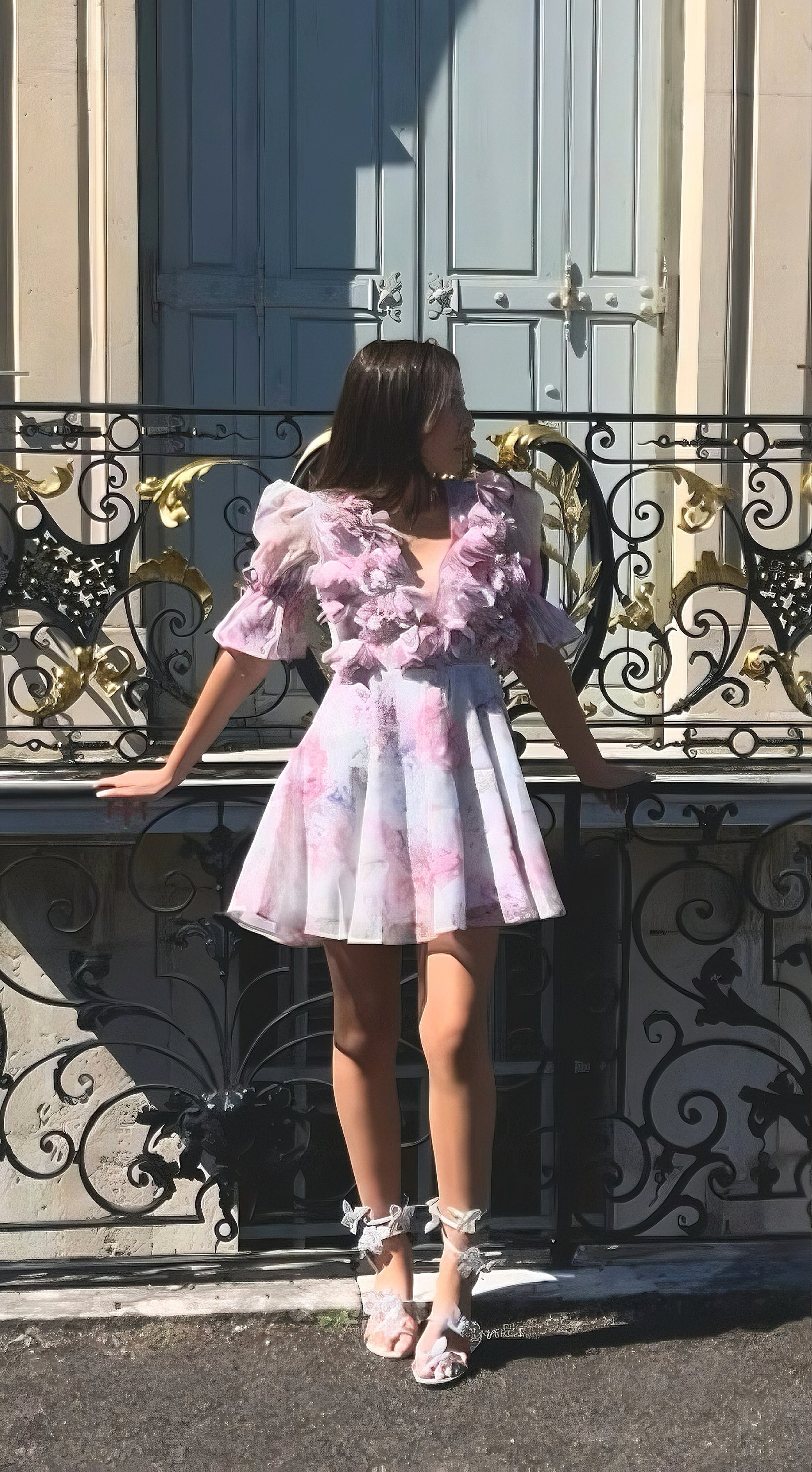Son décolleté orné de fleurs en relief sublime la silhouette sans en faire trop, tandis que sa jupe fluide dévoile juste ce qu'il faut de mouvement à chaque pas.